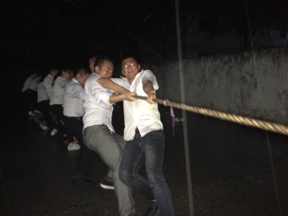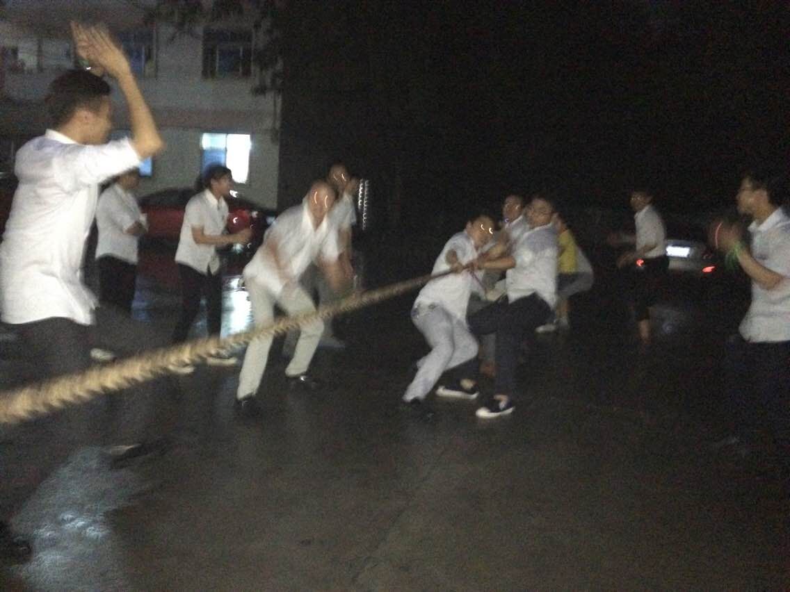 2015年4月7日公司舉行拔河比賽,上午還晴空萬里的天氣,下午卻天公不作美和之前風和日麗的景致截然相反突然下起了大雨,所有一直焦急的等待著雨停,一直到下午6.30分,雖然仍是陰雨飄落,且溫度降低且天已經(jīng)黑了,在經(jīng)過各隊長的商量后一致決定冒雨拔河。