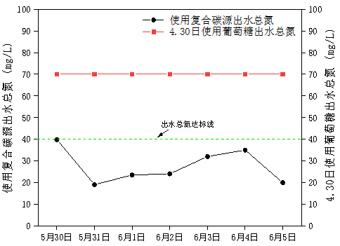 處理后效果:采用我司復合碳源+總氮菌+生物強化技術調試效果顯著,3天時間總氮穩定在40mg/L以下